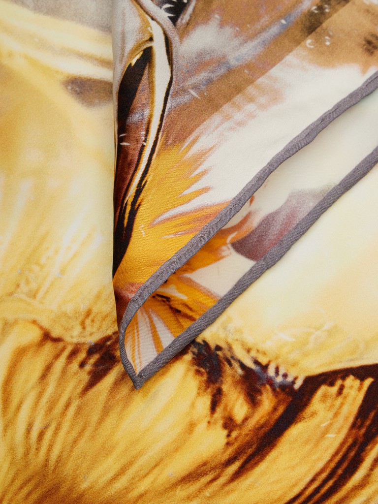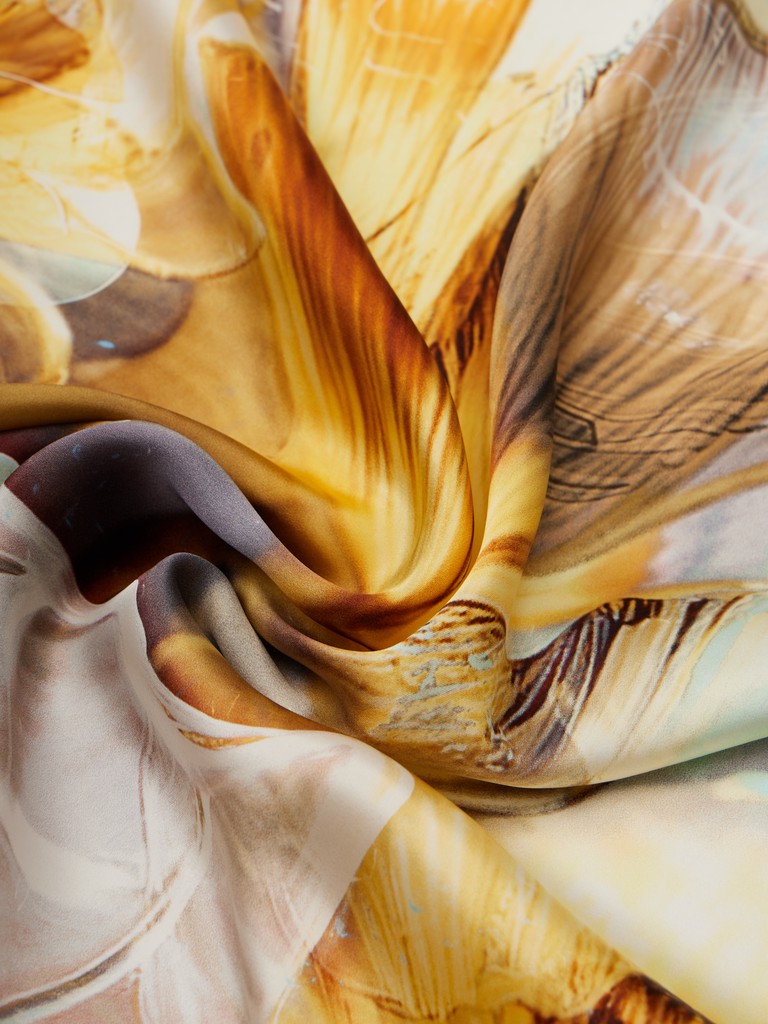 Единый принт наносится на абсолютно непохожие по своему составу материалы — кожу и велюр (сумки и перчатки), шерсть, вискозу, полиэстер, лен и хлопок (платки и одежда), материалы с водостойким покрытием (зонты).