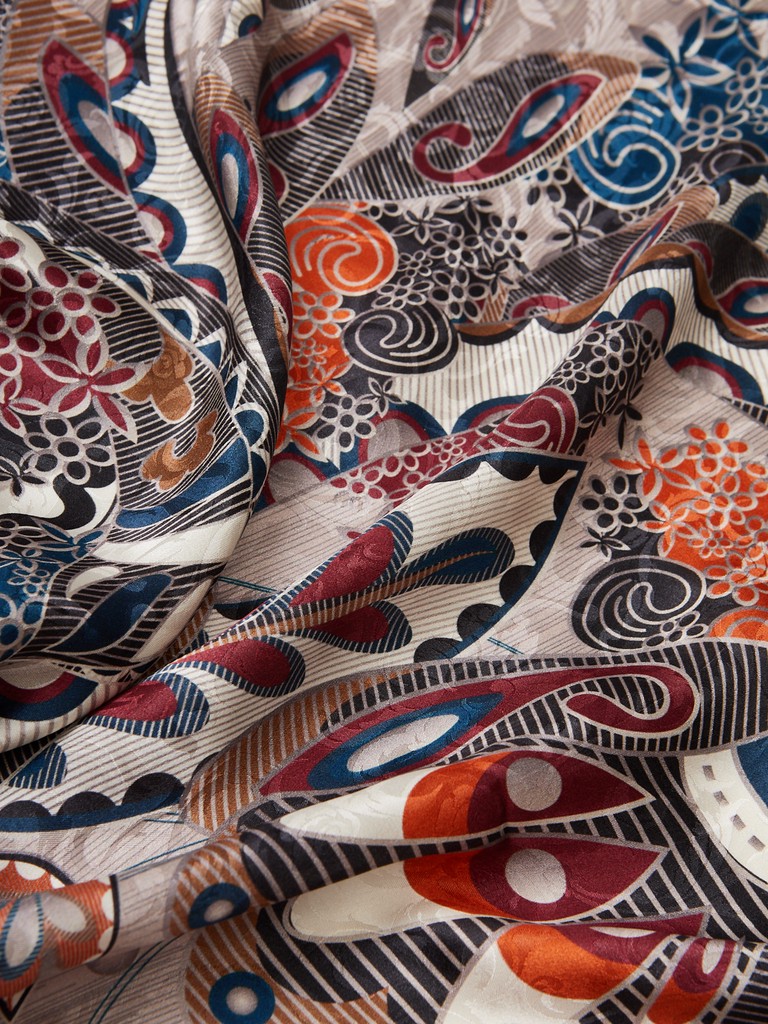 Единый принт наносится на абсолютно непохожие по своему составу материалы — кожу и велюр (сумки и перчатки), шерсть, вискозу, полиэстер, лен и хлопок (платки и одежда), материалы с водостойким покрытием (зонты).