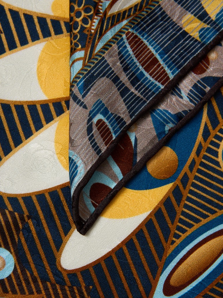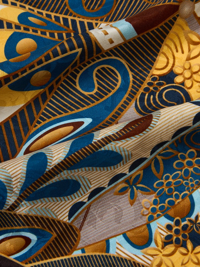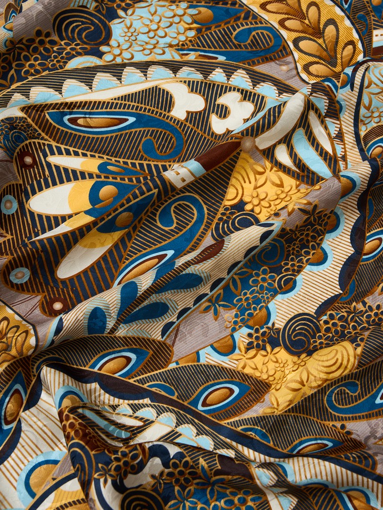 Единый принт наносится на абсолютно непохожие по своему составу материалы — кожу и велюр (сумки и перчатки), шерсть, вискозу, полиэстер, лен и хлопок (платки и одежда), материалы с водостойким покрытием (зонты).
