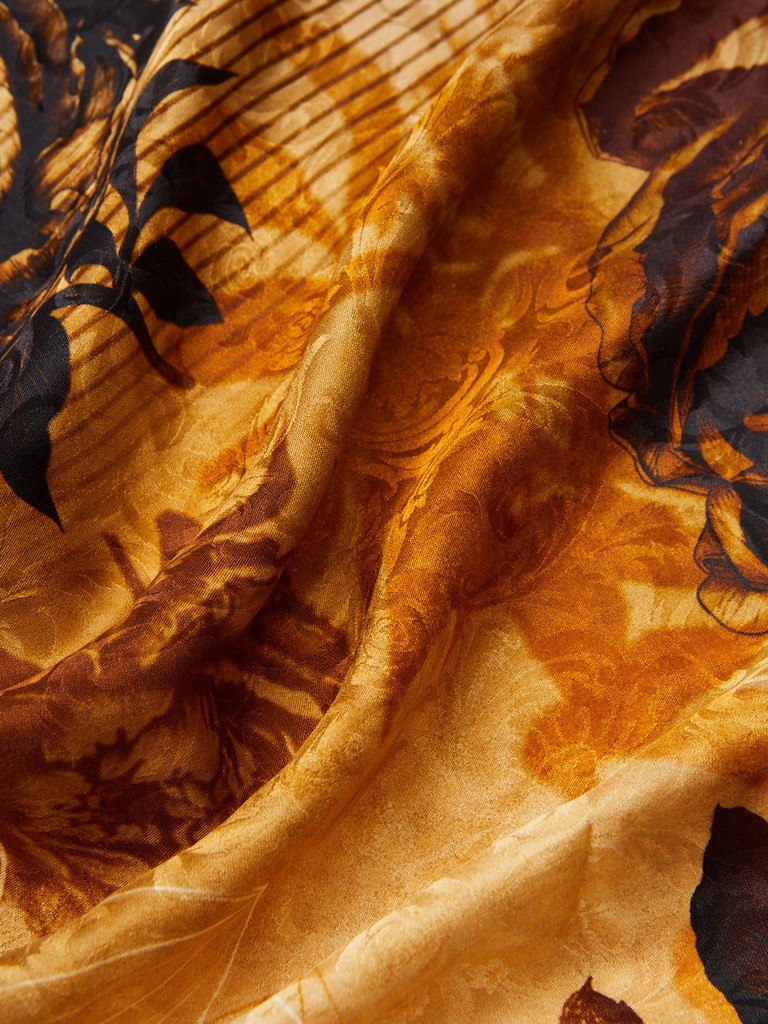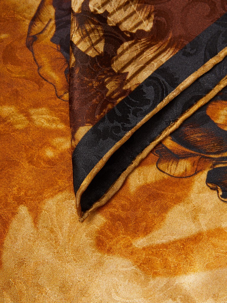 Единый принт наносится на абсолютно непохожие по своему составу материалы — кожу и велюр (сумки и перчатки), шерсть, вискозу, полиэстер, лен и хлопок (платки и одежда), материалы с водостойким покрытием (зонты).