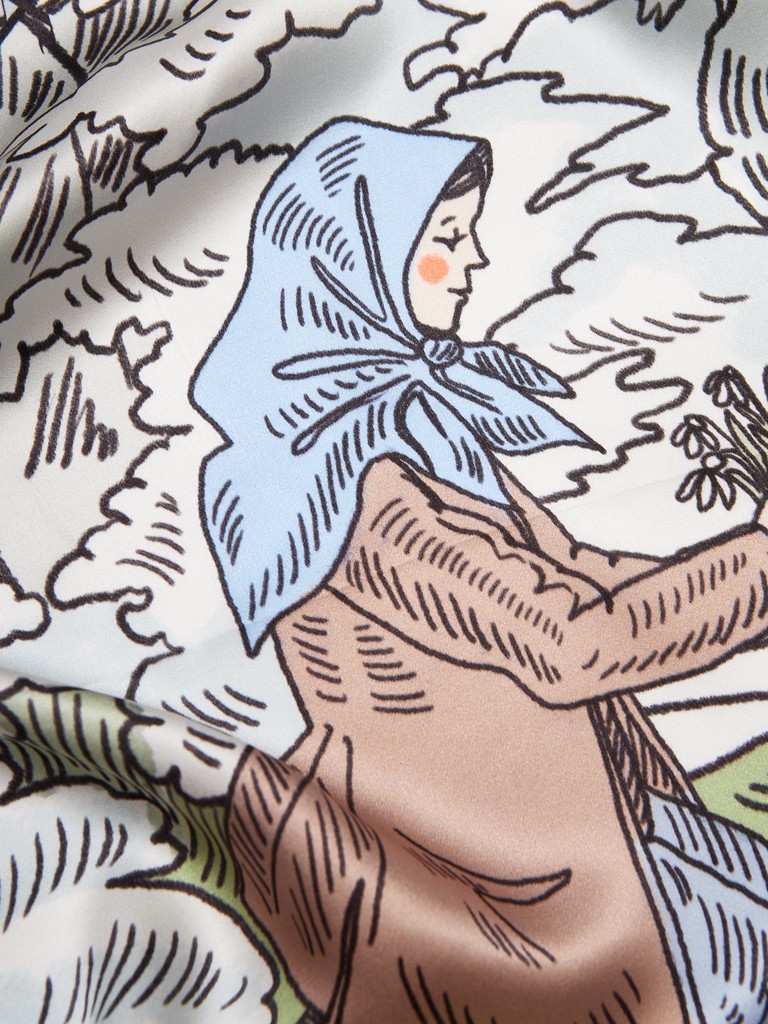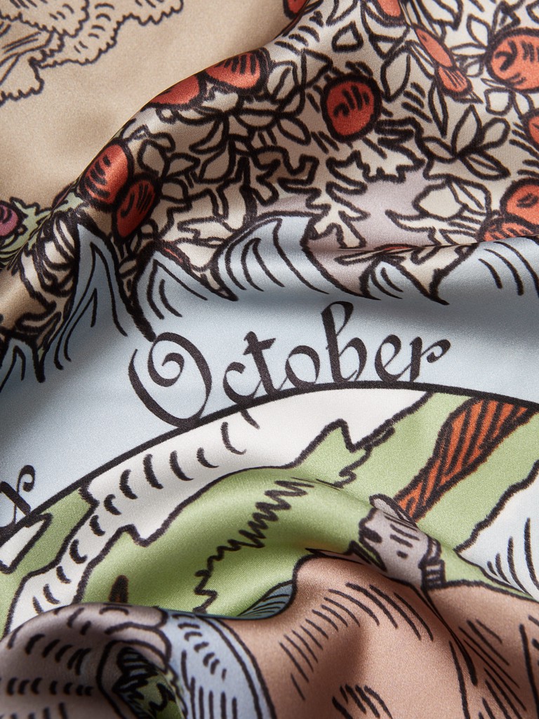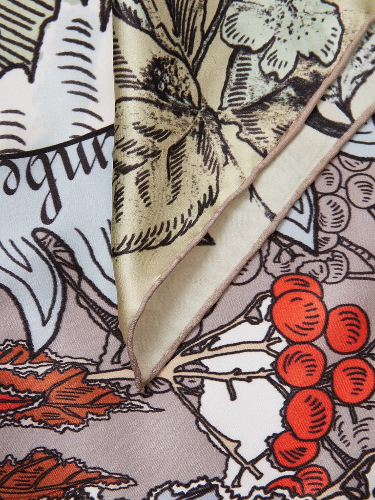 Единый принт наносится на абсолютно непохожие по своему составу материалы — кожу и велюр (сумки и перчатки), шерсть, вискозу, полиэстер, лен и хлопок (платки и одежда), материалы с водостойким покрытием (зонты).