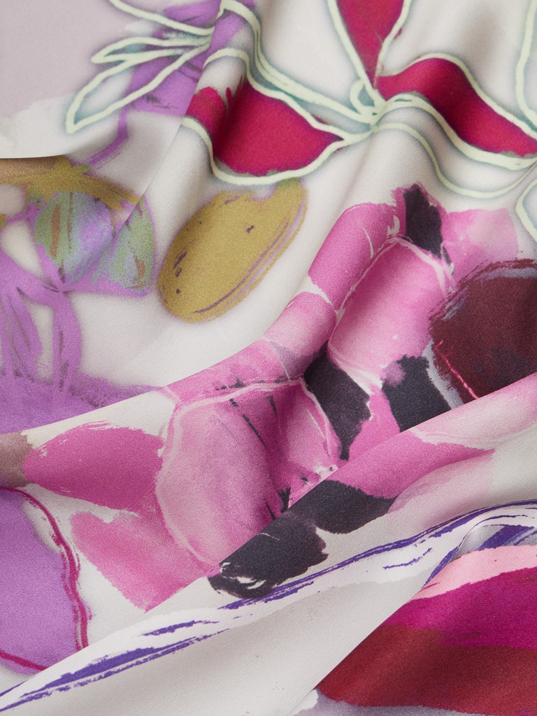 Единый принт наносится на абсолютно непохожие по своему составу материалы — кожу и велюр (сумки и перчатки), шерсть, вискозу, полиэстер, лен и хлопок (платки и одежда), материалы с водостойким покрытием (зонты).