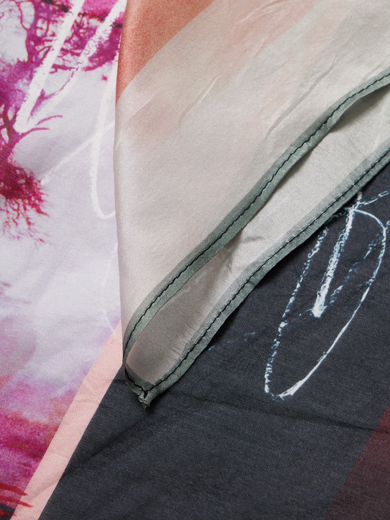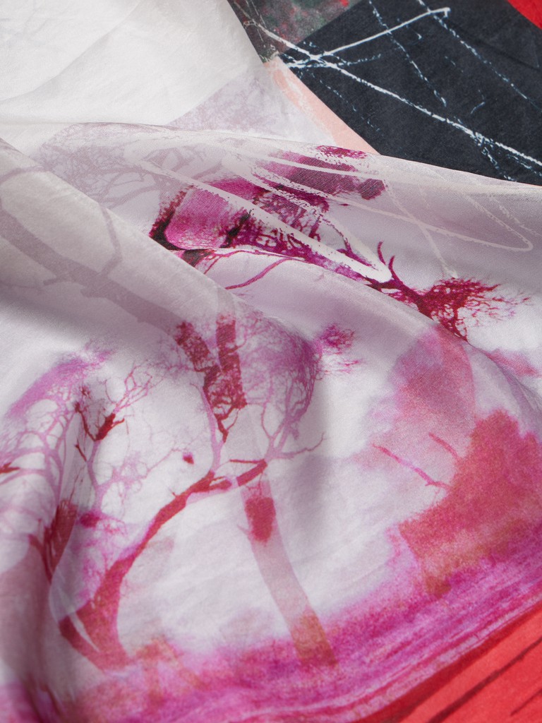 Единый принт наносится на абсолютно непохожие по своему составу материалы — кожу и велюр (сумки и перчатки), шерсть, вискозу, полиэстер, лен и хлопок (платки и одежда), материалы с водостойким покрытием (зонты).