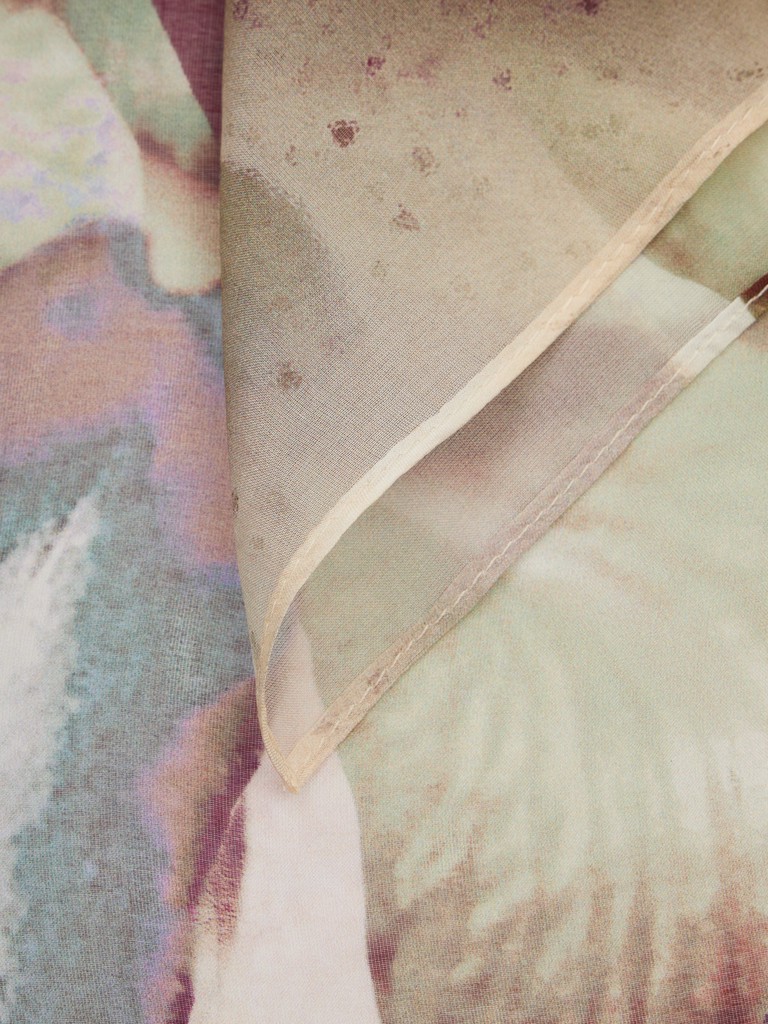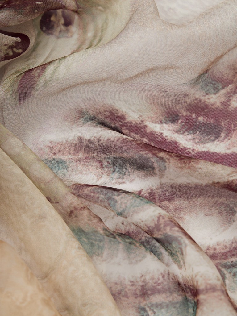 Единый принт наносится на абсолютно непохожие по своему составу материалы — кожу и велюр (сумки и перчатки), шерсть, вискозу, полиэстер, лен и хлопок (платки и одежда), материалы с водостойким покрытием (зонты).