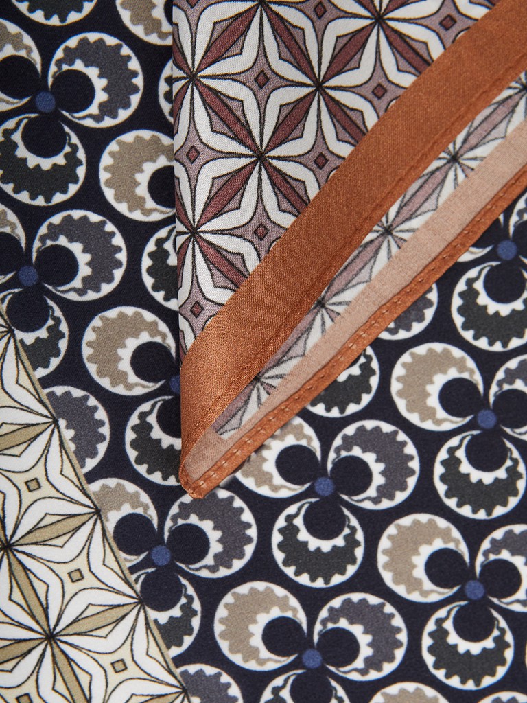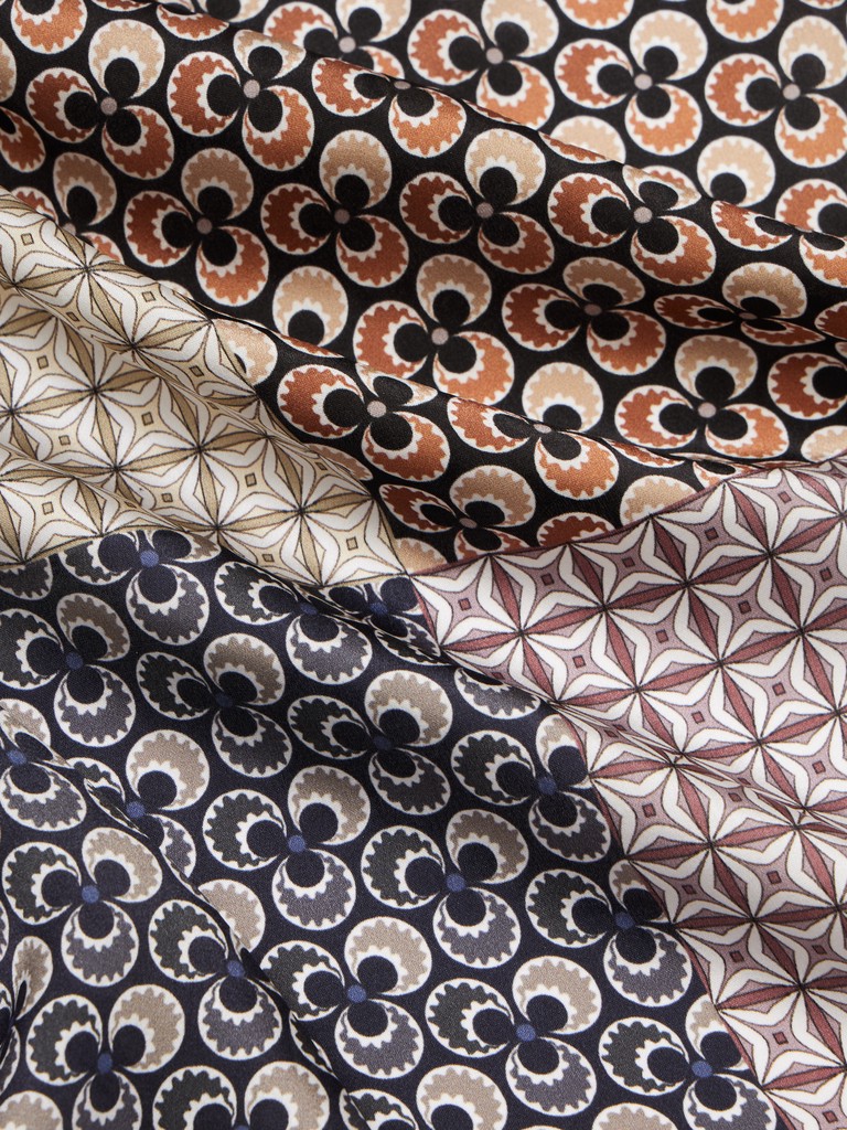 Единый принт наносится на абсолютно непохожие по своему составу материалы — кожу и велюр (сумки и перчатки), шерсть, вискозу, полиэстер, лен и хлопок (платки и одежда), материалы с водостойким покрытием (зонты).