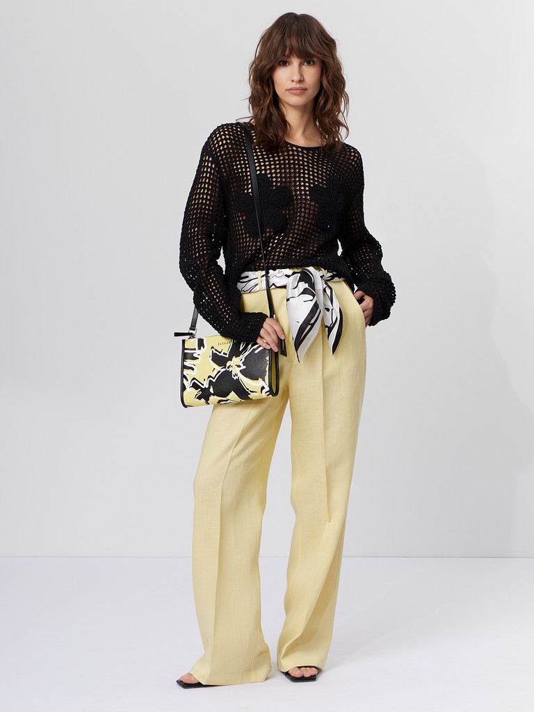 Единый принт наносится на абсолютно непохожие по своему составу материалы — кожу и велюр (сумки и перчатки), шерсть, вискозу, полиэстер, лен и хлопок (платки и одежда), материалы с водостойким покрытием (зонты).