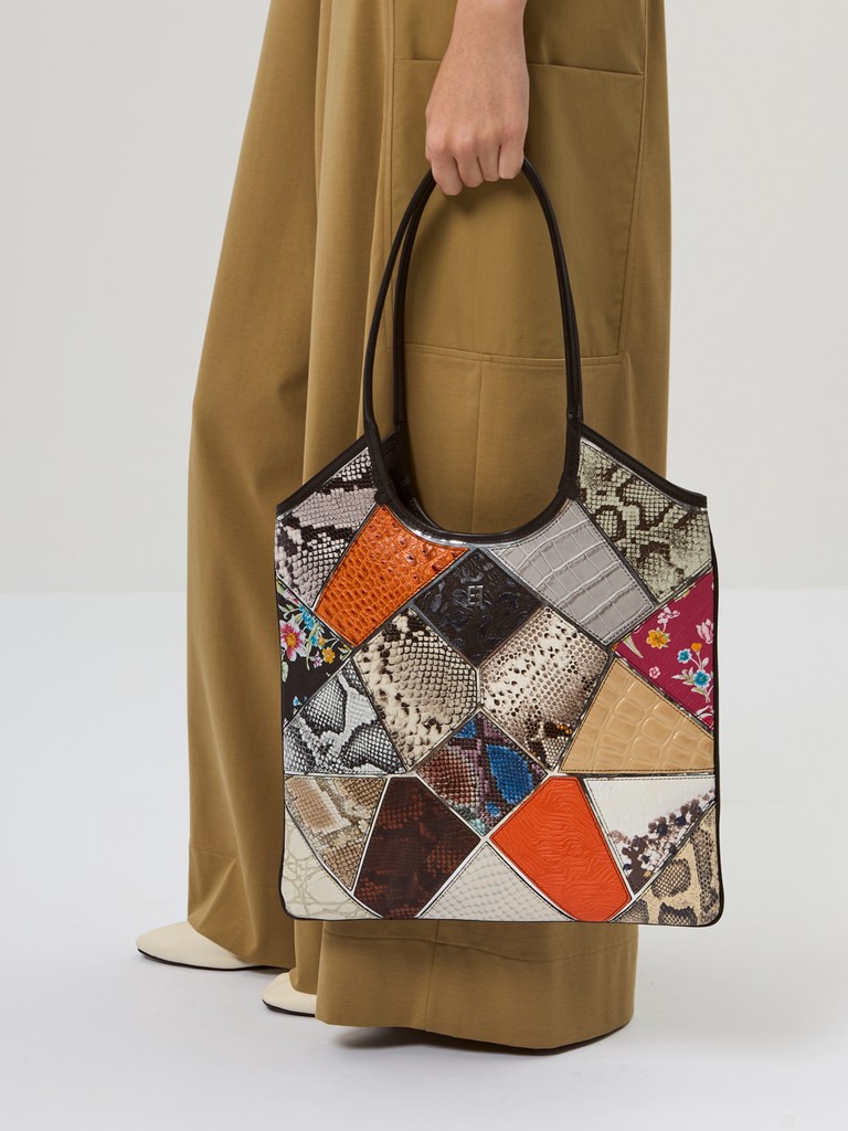 Женская сумка торговой марки Eleganzza из натуральной кожи. Модель застегивается на молнию. Содержит внутри один отдел, в котором имеются карман на молнии и два открытых кармана. На задней стенке есть карман на молнии. Высота ручек - 30 см. Модель не имеет ножки на дне. Вмещает формат А4. *Ручная подборка комбинаций кож. Может отличаться от фото.